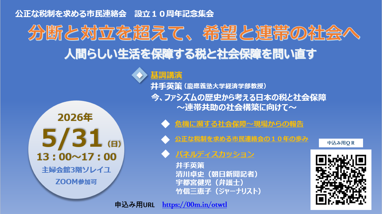 公正な税制を求める市民連絡会は、格差と貧困が拡大する社会構造を見直し、誰もが尊厳をもって人間らしく生きられる社会の実現を目指し、不公正な税制の是正や社会保障の充実を求めて取組を続け、本年で創立10周年を迎えます。